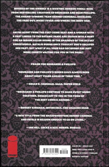 An FBI agent from the cult crime beat and a woman with a past linked to the Satanic Panic are drawn into a terrifying hunt for an insane killer hiding in the shadows of the underworld. Can you ever escape your past, or are all your bad decisions just more ghosts to haunt you, wherever you go? Houses of the Unholy is a riveting horror thrill ride from bestselling creators Ed Brubaker and Sean Phillips, the award-winning team behind Criminal, Reckless, Night Fever, and Where the Body Was.