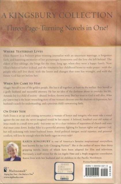 Three Page-Turning Novels in One Volume! Where Yesterday Lives Ellen Barrett is a Pulitzer prize-winning journalist with an uncertain marriage, a forgotten faith, and haunting memories of her picturesque hometown and the love she left behind. The eldest of five siblings, she longs for the time, long ago, when they were a happy family. Now Ellen's beloved father is dead, and she returns to her childhood home to make peace-with the people who still live there, with the losses and changes that time has wrought, and with the future God has set before her. When Joy Came to Stay Maggie Stovall is one of the golden people. She has it all together...at least on the surface. Ben Stovall is a godly husband and successful attorney. He has no idea of the darkness about to overtake his life. Amanda Joy is a child of society-abused, broken, thrown away. But her trust in God is still alive. When Joy Came to Stay is the heart-wrenching story of one woman's descent into the shadows of depression, her husband's search for understanding, and a precious child's unwavering faith. On Every Side Faith Evans is an up-and-coming newscaster, a woman of honor and integrity who must take a stand against the one man she never imagined would be her enemy. A beloved, hundred-year-old statue of Jesus stands in a small-town park-but some say it's a clear violation of separation of church and state that must come down. Jordan Riley is a powerful attorney fighting for human rights and against God, but still reckoning with bitter boyhood losses. Amid political intrigue, social injustice, and personal conflicts, will love be enough when the battle rages on every side? What Readers Are Saying About KAREN KINGSBURY Fiction... "All-and I do mean all-of Karen Kingsbury's books have touched my spiritual life in a deep way. I have recommended her books to men and women alike!" -Debbie, Marana, AZ "Karen Kingsbury's Christian fiction is the standard by which I judge all Christian fiction." -Robin, Fairfax, VA "Karen Kingsbury is our book club's favorite author. We often discuss how each of her novels not only entertain us, but inspire us to live out our faith in a real, everyday, every moment way." -Lynda, Covington, WA "Karen's books never cease to amaze me. After reading one, I not only feel connected to the characters and the events, I feel I've walked in the presence of Christ and He's spoken mightily to me. I always cry when I finish one...tears of good-bye to the friends I've come to love and tears of thankfulness to my heavenly Father. I can' t wait to read the next one!" -Linda, Batavia, IL Story Behind the Book Each of my novels is a piece of my heart. Where Yesterday Lives was my first-ever novel, and as such it is somewhat autobiographical. The childhood story of Ellen Barrett, her love for her parents and siblings, is my story-though her current story and struggles are fictional. On Every Side sheds light on the struggle for religious freedom in today's climate, something I am passionate about. Finally, When Joy Came to Stay is the story of one woman's battle against depression and the secrets of her past.