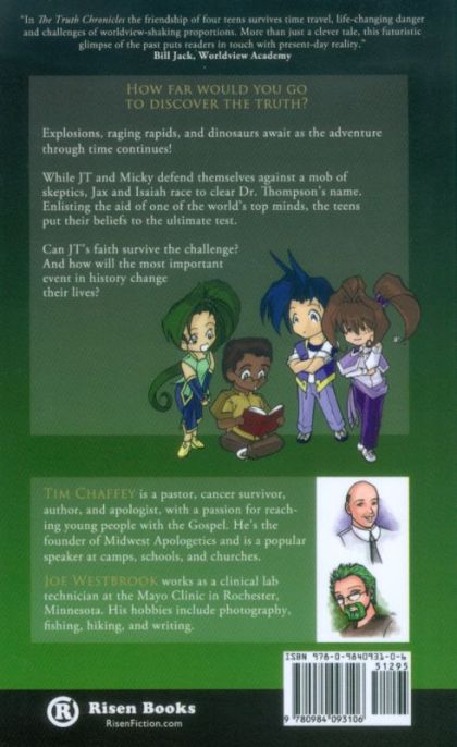 How far would you go to discover the truth? Explosions, raging rapids, and dinosaurs await as the adventure through time continues! While JT and Micky defend themselves against a mob of skeptics, Jax and Isaiah race to clear Dr. Thompson's name.Enlisting the aid of one of the world's top minds, the teens put their beliefs to the ultimate test. Can JT's faith survive the challenge? And how will the most important event in history change their lives? "In The Truth Chronicles the friendship of four teens survives time travel, life-changing danger and challenges of worldview-shaking proportions. More than just a clever tale, this futuristic glimpse of the past puts readers in touch with present-day reality." Bill Jack, Worldview Academy
