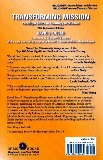 One of the Top 100 Most Significant Books of the Twentieth Century--Christianity Today David Boschs Transforming Mission, now available in over a dozen languages, is widely recognized as an historic and magisterial contribution to the study of mission. Examining the entire sweep of Christian tradition, he shows how five paradigms have historically encapsulated the Christian understanding of mission and then outlines the characteristics of an emerging ""postmodern"" paradigm dialectically linking the transcendent and imminent dimensions of salvation. In this new anniversary edition, Darrel Guder and Martin Reppenhagen explore the impact of Boschs work and the unfolding application of his seminal vision.