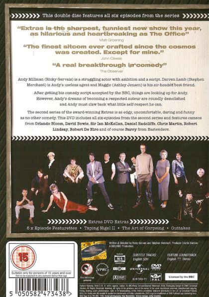 Andy Millman has given up his day job to be an actor, but finds he just can't land the big parts. In fact, he's never even had a speaking role, so spends much of his time hanging around on set with fellow extra and best friend, Maggie Jacobs. Andy envies the A-list stars, but never misses an opportunity to ingratiate himself with them, hoping it will lead to that first elusive line of dialogue. Extras is a comedy series from creators and writers of hit BBC comedy The Office (2001): Ricky Gervais and Stephen Merchant.