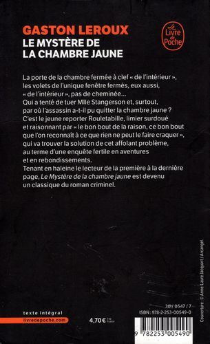 La porte de la chambre fermée à clef « de l’intérieur », les volets de l’unique fenêtre fermés, eux aussi, « de l’intérieur », pas de cheminée…Qui a tenté de tuer Mlle Stangerson et, surtout, par où l’assassin a-t-il pu quitter la chambre jaune ?C’est le jeune reporter Rouletabille, limier surdoué et raisonnant par « le bon bout de la raison, ce bon bout que l’on reconnaît à ce que rien ne peut le faire craquer », qui va trouver la solution de cet affolant problème, au terme d’une enquête fertile en aventures et en rebondissements.Tenant en haleine le lecteur de la première à la dernière page, Le Mystère de la chambre jaune est devenu un classique du roman criminel.