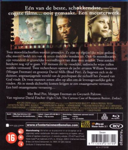 A morbidly obese man is found dead of internal hemorrhages after being force-fed copious amounts of food, and soon police realize that a twisted serial killer is at work. Se7en follows two police detectives as they investigate a series of murders that seem to be inspired by the the seven deadly sins. Jaded and experienced Detective Somerset (Morgan Freeman) is nearing retirement and has been partnered with the young, idealistic and brash Detective Mills (Brad Pitt) for this case. As they follow the unnerving and frightening trail of this strange serial killer, the two detectives must confront the urban decay and apathy of a bleak city and each other over their differences in philosophy and policing style.