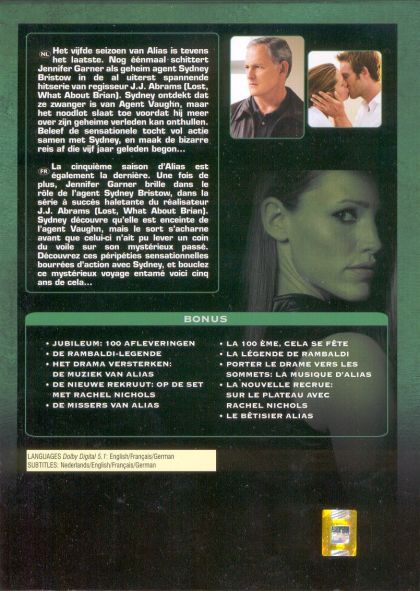 Alias is an American action/drama television series created by J.J. Abrams which was broadcast on ABC from September 30, 2001 to May 22, 2006, spanning five seasons. It starred Jennifer Garner as Sydney Bristow, an agent who had been tricked to believe she was working for the U.S. government but had, in fact, been working for a criminal organization named the Alliance of Twelve. Upon learning this Sydney became a double agent for the real CIA, feeding information from SD-6 to them.