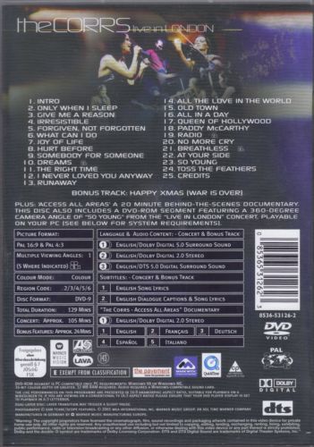 The Corrs play a very special live concert at London's legendary Wembley Arena. The 116-minute set includes songs from their third album, "In Blue," a brand new version of their instrumental "Paddy McCarthy," and a special performance of John Lennon and Yoko Ono's "Happy X-Mas (War is Over)".