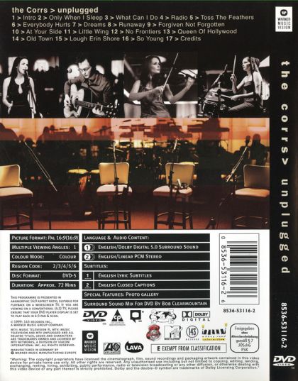 Unplugged is an album by Irish band The Corrs, released in 1999. The album is part of MTV's Unplugged series. This session was recorded live on October 5, 1999 (1999-10-05) in front of an audience at Ardmore Studios, Co. Wicklow, Ireland. Tracklist: 1. Only When I Sleep 2. What Can I Do 3. Radio 4. Toss The Feathers 5. Everybody Hurts 6. Dreams 7. Runaway 8. Forgiven Not Forgotten 9. At Your Side 10. Little Wing 11. No Frontiers 12. Queen Of Hollywood 13. Old Town 14. (Lough) Erin Shore 15. So Young