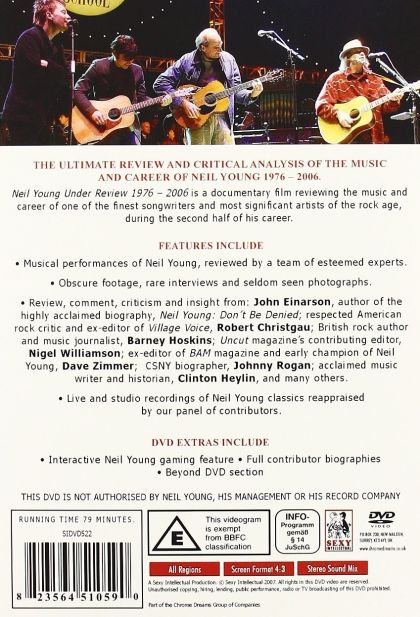 Neil Young Under Review 1976 - 2006 is a documentary film reviewing the music and career of one of the finest songwriter and most significant artists of the rock age - during the second half of his career. It includes live and studio recordings of Neil Young classics reappraised by a panel of contributors, and obscure footage, rare interviews and seldom seen photographs of and with Neil. It also includes review, comment, criticism and insight from; John Einarson, author of the highly acclaimed biography "Neil Young : Don't Be Denied"; respected American rock critic and ex-editor of Village Voice, Robert Christgau; British rock author and music journalist, Barney Hoskins; Uncut magazine's contributing editor, Nigel Williamson; ex-editor of BAM magazine and early champion of Neil Young, Dave Zimmer; CSNY biographer, Johnny Rogan; acclaimed music writer and historian, Clinton Heylin, and many others.