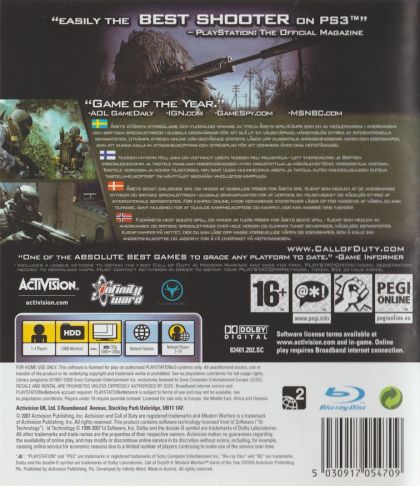 The new action-thriller from the award-winning team at Infinity Ward, the creators of the Call of Duty series, delivers the most intense and cinematic action experience ever. Call of Duty 4: Modern Warfare arms gamers with an arsenal of advanced and powerful modern day firepower and transports them to the most treacherous hotspots around the globe to take on a rogue enemy group threatening the world. As both a U.S Marine and British S.A.S. soldier fighting through an unfolding story full of twists and turns, players use sophisticated technology, superior firepower and coordinated land and air strikes on a battlefield where speed, accuracy and communication are essential to victory. The epic title also delivers an added depth of multiplayer action providing online fans an all-new community of persistence, addictive and customizable gameplay.