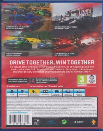 Get ready for a racing game like never before. Developed exclusively for the PlayStation(r)4 (PS4) system by Evolution Studios, the team behind the best-selling MotorStorm(r) franchise, DRIVECLUB is all about you and your friends. It's about teamwork; it's about everyone fighting for one another and earning rewards together - and most importantly it's about sharing in the sheer thrill of every race. Enjoy the excitement of high-speed solo racing, or join a racing club to discover what DRIVECLUB is all about. Created specifically with the next-generation gamer in mind, DRIVECLUB leverages the networking power and social capabilities of the PS4 to seamlessly and immediately connect you and your friends, always allowing you to share your experiences, send and receive challenges, and keep up to speed with your team's performance.
