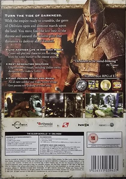 Oblivion is the quintessential role-playing game for the next generation and another leap forward in gaming. Step inside the most richly detailed and vibrant game-world ever created. Oblivion is the latest chapter in the epic and highly successful Elder Scrolls saga and utilizes the latest PC and next-generation video game hardware to fully immerse you into the experience. With a powerful combination of freeform gameplay and unprecedented graphics, you can unravel the main quest at your own pace or explore the vast world and find your own challenges.