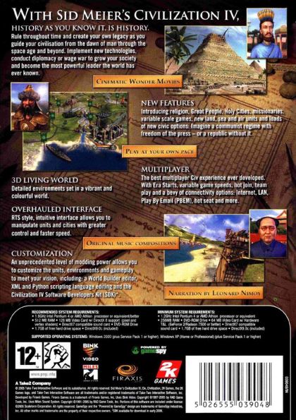 With over 6 million units sold and unprecedented critical acclaim from fans and press around the world, Sid Meier's Civilization is recognized as one of the greatest PC game franchises of all-time. Now, Sid Meier and Firaxis Games will take this incredibly fun and addictive game to new heights by adding new ways to play and win, new tools to manage and expand your civilization, all-new easy to use mod capabilities and intense multiplayer modes and options. Civilization IV will come to life like never before in a beautifully detailed, living 3D world that will elevate the gameplay experience to a whole new level. Civilization IV has already been heralded as one of the top ten games of 2005, and a must-have for gamers around the globe!