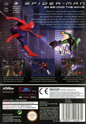 Spider-Man: The Movie Game immerses the players in the high-swingin', web-slingin' world of the feature film starring Tobey Maguire and Willem Dafoe (due for release in June 2002). The player assumes the role of the super hero himself, weighing great power with great responsibility as he embarks on a career to thwart crime and put an end to a mastermind criminal, the Green Goblin, and his legions of evil. All-new aerial combat, in-air control and free-roaming capabilities add to a franchise that has already enjoyed astonishing success.