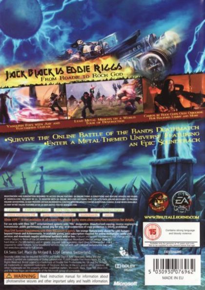From the mind of Tim Schafer comes the ultimate heavy metal action game starring Jack Black. You are heavy metal roadie Eddie, Riggs, hurled back in time to the mythical Age of Metal when the world was formed and ruled by the power of Rock! Armed with a broadaxe, a guitar and a big block V8, you set off on an epic quest to assemble an army of headbangers, hotrods, barbarians, demonic dominatrix and the undead. With the wings of a demon and the power of a Rock God, you must lead humanity in an epic war against its barbaric overlords, and carve your name forever into Brütal Legend.