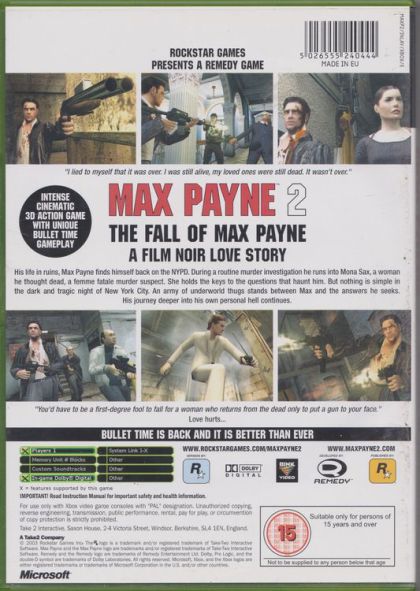 When Max Payne debuted in July 2001 as an award-winning, best-selling PC game, it revolutionized the action genre with its cinematic combat sequences fueled by the groundbreaking use of slow motion and compulsive narrative-driven gameplay. Now, Remedy is working closely with Rockstar Games on the highly anticipated sequel to the blockbuster hit. Max Payne 2: The Fall of Max Payne delivers the most intense gameplay experience imaginable.
