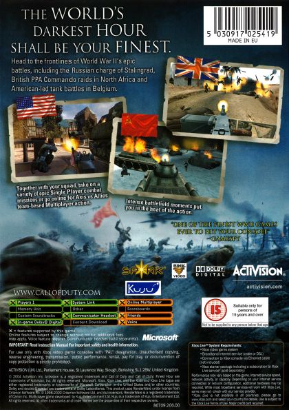 Call of Duty: Finest Hour – The newest installment in the award-winning Call of Duty series, Call of Duty: Finest Hour takes console players to the frontlines of combat to experience the cinematic intensity, chaos of battle and epic moments of World War II across new campaigns across the North African, Western and Eastern Fronts. An original game for the console systems, Call of Duty: Finest Hour delivers all-new missions featuring authentic squad-based combat, explosive vehicle action and cinematic special effects to deliver a breathtaking first person action thriller. Covering three Allied campaigns, players experience some of history's most intense battles and for the first time assume the role of multiple characters within the Russian, British and American forces. Call of Duty: Finest Hour is being developed by Spark, which is comprised of over 30 individuals who developed titles in the Medal of Honor series, including several of the production leads.