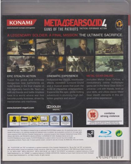 Metal Gear Solid 4: Guns of the Patriots is the final chapter in the saga of Solid Snake which sends him around the world in pursuit of his arch nemesis, Liquid Ocelot. Armed with new gadgets and abilities, Solid Snake must shift the tides of war into his favor, using the chaos of the battlefield to infiltrate deep into enemy territory. In his globetrotting final mission, Snake must sneak deep into enemy locations in the Middle East, South America, and other corners of the earth to foil Liquid Ocelot's plans for total world domination.