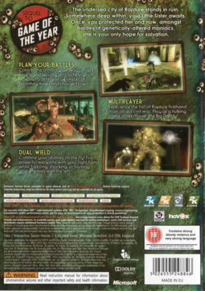 Multiplayer in BioShock 2 provides a rich prequel experience that expands the origins of the BioShock fiction. Set during the fall of Rapture, players assume the role of a Plasmid test subject for Sinclair Solutions, a premier provider of Plasmids and Tonics in the underwater city of Rapture that was first explored in the original BioShock. Players will need to use all the elements of the BioShock toolset to survive as the full depth of the BioShock experience is refined and transformed into a unique multiplayer experience that can only be found in Rapture.