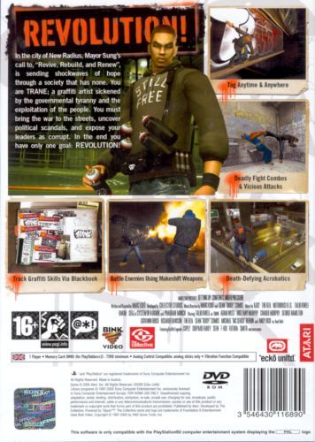 The story's "Get In, Get Up and Get Out" gameplay mechanic offers gamers an arsenal of swift sneak and street fighting abilities to GET IN restricted areas of New Radius and battle through the city's rough streets; the dexterity and agility needed to scale any object, GET UP and place graffiti tags, spreading the message of rebellion; and the ingenuity to evade, escape and GET OUT.