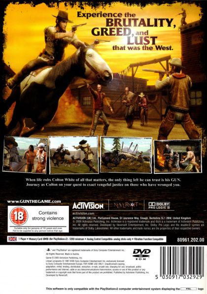 Set in the untamed West of the late-1800s, GUN is a free-roaming action-adventure game that takes players to a world without laws where greed, lust and murder are rampant. As Colton White, a vengeful gunslinger, players must straddle the line between good and evil as they showdown against corrupt lawmen, a murderous preacher, renegade army psychopaths, merciless outlaws and unforgiving Native Americans, while waging war on horseback, collecting bounties, and commandeering trains. Players travel through an action-packed landscape of high mountain wilderness, deserts and bustling territorial towns in an epic story of betrayal, greed, and revenge.