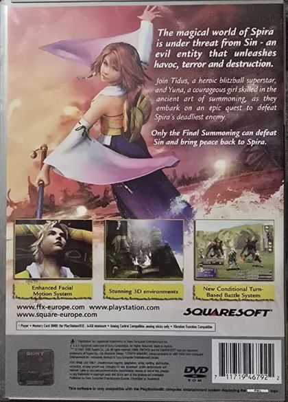 Immerse yourself in a world that has been devastated by a mysterious force known only as "Sin". Human existence teeters on the brink of extinction when Sin willfully destroys cities and lives. Final Fantasy X makes history by being the first Final Fantasy installment to integrate voiceovers into a majority of the story scenes. Along with a special effects system known as the "Facial Motion System," this feature breathes new life into the characters, story, and the Final Fantasy series itself.