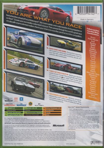 "Forza Motorsport" is the first fully customizable driving simulator for Xbox. With authentic handling and damage physics, lifelike graphics, and realistic tuning options, "Forza Motorsport" brings the automotive experience to life. Feel the pride of owning more than 200 models from automakers such as Nissan, Honda, Ferrari, Porsche, Tommy Kiara and over 40 other manufacturers. Players express themselves with endless visual customization options choosing from 150 aftermarket brands, a million unique paint schemes, and enough decals for every car imaginable and then make their vehicles roar on the road with engine upgrades ranging from turbo kits to engine swaps.