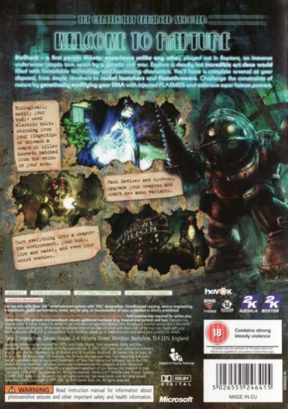 BioShock is a revolution in the shooter genre that will forever change the expectations for the FPS. Going beyond "run and gun corridors," "monster-closet AIs" and static worlds, BioShock creates a living, unique and unpredictable FPS experience. BioShock is the Shooter 2.0.