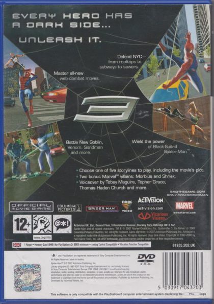Based on Sony Pictures Entertainment's Columbia Pictures' upcoming feature film, Spider-Man 3 allows players to experience the actions of heroic red-suited Spider-Man and, for the first time ever, his darker, more mysterious black-suited persona. Set in a larger, dynamic, free-roaming New York City, the game gives players the freedom to choose their own gameplay experience through multiple movie-based and original storylines, fully integrated city missions and performance rewards including improved speed, combat maneuvers and agility. In Spider-Man 3, players draw upon Spider-Man's completely revamped combat abilities as they protect the city and defeat nemeses using expanded aerial fighting, finishing moves and dynamic webbing during missions and epic boss battles.