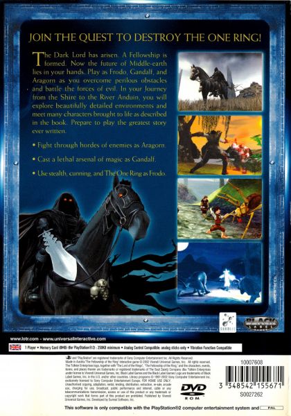 The Fellowship of the Ring is a single-player action-adventure game featuring Frodo, Gandalf and Aragorn. It is based on the first part of J.R.R. Tolkien's epic novel "The Lord of the Rings." From the peaceful lands of the Shire through the darkness of Moria, to the River Anduin, the player must gather the Fellowship and protect the One Ring from the Dark Lord Sauron.