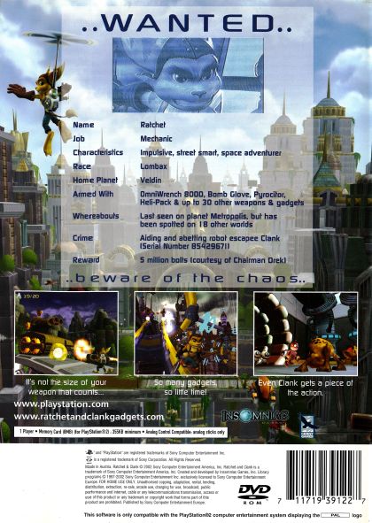 In one of the factories creating Chairman Drek's evil armies, a computer glitch creates a small but smart robot – Clank. Learning about the Chairman Drek's plans, Clank flees the factory seeking help, but his ship is shot down over Ratchet's homeworld. Forced together by circumstance, Ratchet and Clank blast off from planet to planet through an extraordinary sci-fi universe. The unlikely pals encounter imaginative characters, acquire a plethora of weapons and gadgets, and blow up everything in their path, as they uncover more of the Chairman Drek's plan.