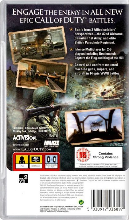 Call of Duty: Roads to Victory brings the signature cinematic intensity and chaos of battle to handheld fans for the first time in an all-new, gameplay experience that allows gamers to take the #1 WWII first-person action franchise on the go. Featuring all-new missions, never-before seen in a Call of Duty game, Call of Duty: Roads to Victory thrusts players into the boots of an 82nd Airborne Division infantry soldier, a Canadian First Army rifleman (both new to the franchise) and an elite British Parachuting Regiment commando. Featuring a completely unique set of challenges that include mounted machine gun battles, sniper encounters and aircraft attacks, Call of Duty: Roads to Victory enlists handheld gamers into the fast-paced action and adrenaline-pumping intensity of Call of Duty.