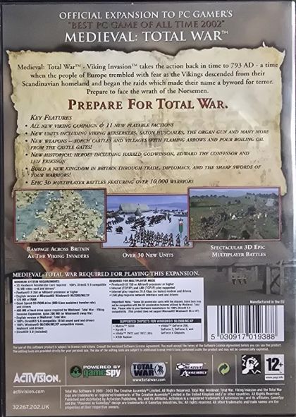 Medieval: Total War Viking Invasion is the expansion pack to the award-winning Medieval: Total War, and takes the action of the game to a new level and a new time. In 793AD the Vikings attacked the monastery at Lindisfarne in Northumbria, killing the monks and nuns, destroying one of Northern Europe's great centres of learning, and carrying off every precious object they could prise from the dead hands of the monks.