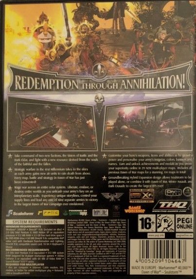 Take command of two new factions, the Sisters of Battle and the Dark Eldar, and fight with a new resource derived from the souls of the faithful and the fallen. Strategic warfare in the 41st Millennium takes to the skies as each army gains new air units to rain death from above. Every map, battle and strategy in Dawn of War has just been reinvented!