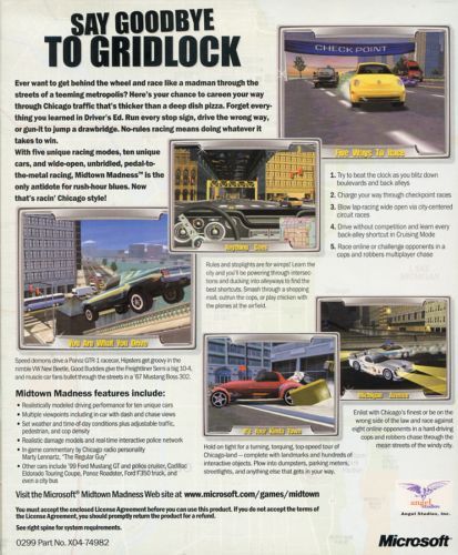Midtown Madness is the first vehicular racing game to render a "virtual Chicago", including over a 100km of roads, city landmarks, pedestrians, changing weather conditions, a 'live' police system, dozens of shortcuts and hundreds of interactive objects. Race in a cool collection of 9+ licensed vehicles - from exotic race cars to semi-trucks - each with incredibly accurate physics, damage modeling and unique strengths for navigating city streets.Midtown Madness features exciting racing scenarios with no fixed tracks to restrict you. Create your own best course with virtually unlimited shortcuts and routes through the city.