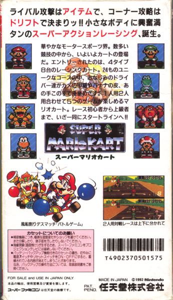 The Super Mario GoKart Park is open for tons of racing fun! Hit the track with Mario, Luigi, Yoshi and the Princess. Get tough and lock fenders with Donkey Kong, Jr. and Bowser. Even Toad and Koopa Troopa will mix it up in an all-out quest for the Gold Cup! Race head-to-head with a friend or challenge the computer in great, split-screen, Mode 7 graphics.