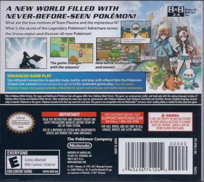 Pokémon White Version is a handheld Role-Playing game (RPG) for play on the Nintendo DS / DSi. Released as a companion game to the DS / DSi title Pokémon Black Version, in it players enjoy classic challenging RPG-Adventure Pokémon gameplay as they capture wild Pokémon and utilize them in face-offs against other Trainers to see who is the best. Additional freatures include: access to the Legendary Pokémon, Zekrom; the player's choice of one of three starter Pokémon; an all-new and diverse game region, Unova; improved graphics; multiple new battle modes; the ability to wirelessly trade Pokémon; multiplayer options and more.