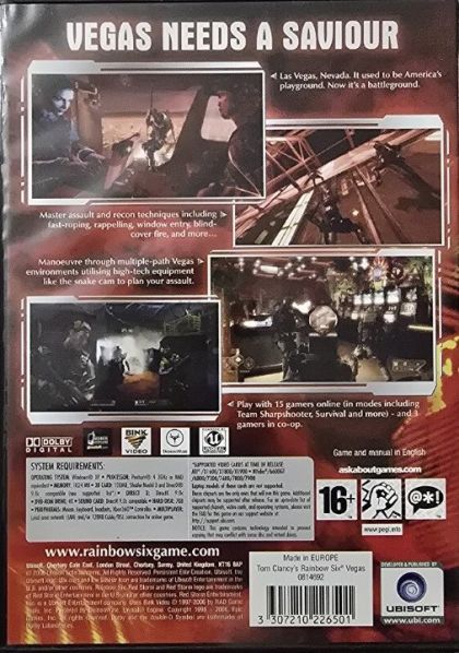 Tom Clancy's Rainbow Six makes its next-generation hardware debut in the most dramatic installment of the renowned first-person shooter franchise to date. Rainbow operatives take to the chaotic streets of Las Vegas as an escalating terrorist siege in "Sin City" threatens to take world terrorism to new, uncontrollable heights. The future of global security hangs in the balance as you battle to defend classic Vegas locations and environments like Fremont Street, the Strip and casinos. Experience Las Vegas like never before ... through revolutionary next generation technology as you work against the clock to protect one of the world's most recognizable cities from utter devastation.
