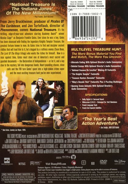 Modern treasure hunters, led by archaeologist Ben Gates, search for a chest of riches rumored to have been stashed away by George Washington, Thomas Jefferson and Benjamin Franklin during the Revolutionary War. The chest's whereabouts may lie in secret clues embedded in the Constitution and the Declaration of Independence, and Gates is in a race to find the gold before his enemies do.