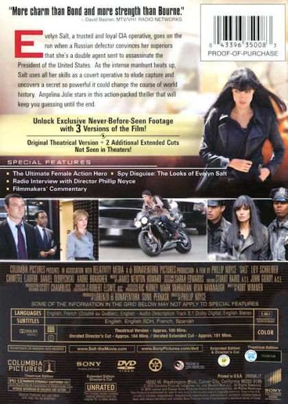 As a CIA officer, Evelyn Salt swore an oath to duty, honor and country. Her loyalty will be tested when a Russian defector accuses her of being a Russian sleeper spy. She goes on the run, using all her skills and years of experience as a covert operative to elude capture, protect her husband, and stay one step ahead of her colleagues at the CIA. Her efforts to prove her innocence only serve to cast doubt on her motives, as the hunt to uncover the truth behind her identity continues and the question remains: "Who is Salt?"