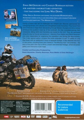 Ewan McGregor and Charley Boorman return for another unforgettable adventure this time riding the Long Way Down. Facing a brand new set of challenges the intrepid pair discover spectacular but unforgiving terrain, rich cultures and unforgettable local characters. They travel From John O Groats to Cape Town descending through Western Europe and Africa before arriving at the southern most tip of the continent. On their incredible journey their endurance, biking skills and friendship are tested to the limit. They are partnered along the way by friends and producer/directors David Alexanian and Russ Malkin who were responsible for organizing the expedition and filming the documentary.
