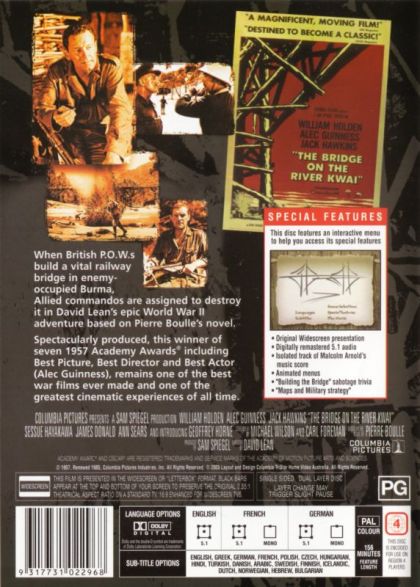 The classic story of English POWs in Burma forced to build a bridge to aid the war effort of their Japanese captors. British and American intelligence officers conspire to blow up the structure, but Col. Nicholson, the commander who supervised the bridge's construction, has acquired a sense of pride in his creation and tries to foil their plans.
