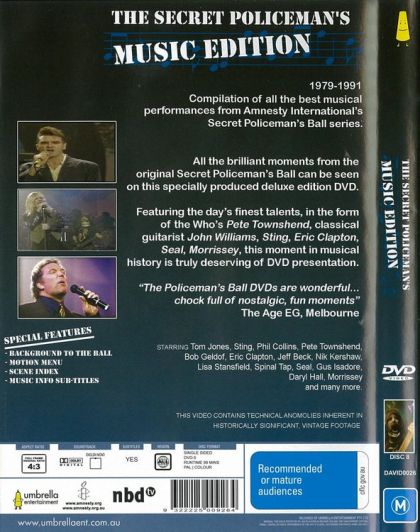 Compilation of all the best musical performances from Amnesty International's Secret Policeman's Ball series. All the brilliant moments from the original Secret Policeman's Ball can be seen on this specially produced deluxe edition DVD. Featuring the day's finest talents, in the form of the Who's Pete Townshend, classical guitarist John Williams, Sting, Eric Clapton, Seal, Morrissey, this moment in musical history is truely deserving of DVD presentation.