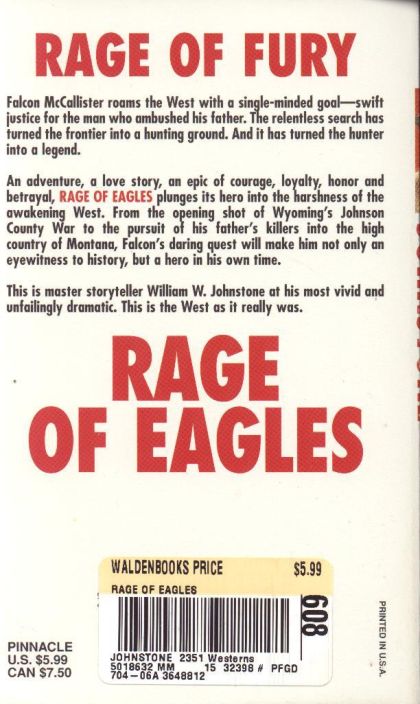 "Falcon McCallister roams the West with a single-minded goal-swift justice for the man who ambushed his father. The relentless search has turned the frontier into a hunting ground. And it has turned the hunter into a legend. An adventure, a love story, an epic of courage, loyalty, honor and betrayal, RAGE OF EAGLES plunges its hero into the harshness of the awakening West. From the opening shot of Wyoming's Johnson County War to the pursuit of his father's killers into the high country of Montana, Falcon's daring quest will make him not only an eyewitness to history, but a hero in his own time."--BOOK COVER