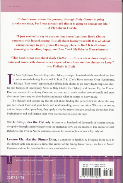 In Sink Reflections, Marla Cilley -- the FlyLady -- helped hundreds of thousands of her fans combat overwhelming household C.H.A.O.S. (Can't Have Anyone Over Syndrome). Taking a "baby-steps" approach, she offered little chores to do every day, to wipe out clutter and feelings of inadequacy. Now, in Body Clutter, the FlyLady and Leanne Ely, the Dinner Diva and creator of the Saving Dinner series, team up to teach readers how to handle and erase the clutter they carry on their bodies and minds when it comes to body image. The FlyLady and Leanne say that it's not about finding the perfect diet, it's about the way you feel about food and your body and understanding sound nutrition. With warm voices, unique lingo, and no preaching, they apply a step-by-step technique, coaching the readers from beginning to end and sharing their own success stories along the way.