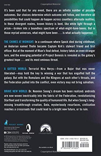 It's been said that for any event, there are an infinite number of possible outcomes. Our choices determine which outcome will follow, and therefore all possibilities that could happen do happen across countless alternate realities. In these divergent realms, known history is bent, like white light through a prism -- broken into a boundless spectrum of what-might-have-beens. But in those myriad universes, what might have been...is what actually happened. THE CHIMES AT MIDNIGHT: In a continuum where Spock died during childhood, an Andorian named Thelin became Captain Kirk's stalwart friend and first officer. But at the moment of Khan's final defeat, history takes an even stranger turn, and the emerging potential of Project Genesis is revealed as the galaxy's greatest hope...and its most ominous threat. A GUTTED WORLD: Terrorist Kira Nerys -- from a Bajor that was never liberated -- may hold the key to winning a war that has engulfed half the galaxy. But with the Romulans and the Klingons at each other's throats, and the Federation pulled into the conflict, even victory may not bring salvation. BRAVE NEW WORLD: Dr. Noonien Soong's dream has been realized: androids are now woven inextricably into the fabric of the Federation, revolutionizing Starfleet and transforming the quality of humanoid life. But when Soong's long-missing breakthrough creation, Data, mysteriously resurfaces, civilization reaches a crossroads that could lead to a bright new future, or to ruin.