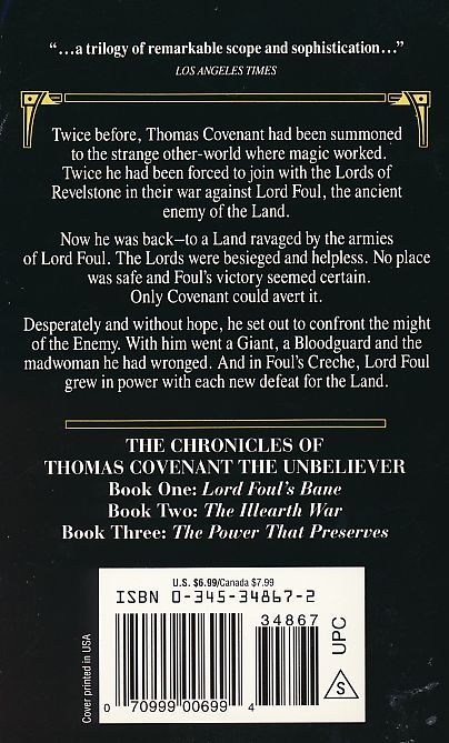 “A trilogy of remarkable scope and sophistication.”—Los Angeles TimesTwice before Thomas Covenant had been summoned to the strange otherworld where magic worked. Twice before he had been forced to join with the Lords of Revelstone in their war against Lord Foul, the ancient enemy of the Land. Now he was back—to a Land ravaged by the armies of Lord Foul. The Lords were besieged and helpless. No place was safe, and Foul's victory seemed certain. Only Covenant could avert it. Desperately and without hope, he set out to confront the might of the Enemy. Along with him traveled a Giant, a Bloodguard, and the madwoman he had wronged. And in Foul's Creche, Lord Foul grew in power with each new defeat for the Land. . . .