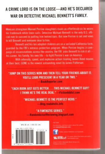 A crime lord has declared war on America. Only Detective Michael Bennett knows why.Manuel Perrine doesn't fear anyone or anything. A charismatic, ruthless strongman, he slaughters rivals as effortlessly as he wears his trademark white linen suits. Detective Michael Bennett is the only U.S. official ever to succeed in putting Perrine behind bars. But now Perrine is out-and vows to find and kill Bennett and everyone dear to him. Bennett and his ten adopted children are living on a secluded California farm, guarded by the FBI's witness protection program. Soon Perrine begins a campaign of assassinations, brazenly slaughtering powerful individuals across the country. The FBI has no clue where Perrine is hiding or how he is orchestrating his attacks, forcing Bennett to risk it all: his career, his family, and even his life.With intensity, speed, and explosive action rivaling James Bond movies at their best-and featuring one of the most complex and chilling villains ever created-Gone is James Patterson at his astounding best.