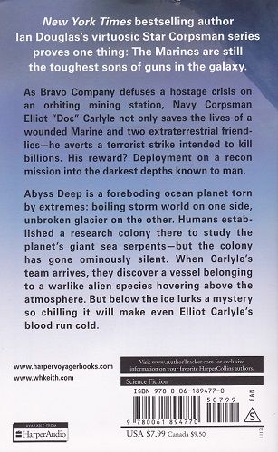 New York Times bestselling author Ian Douglas's virtuosic Star Corpsman series proves one thing: The Marines are still the toughest sons of guns in the galaxy.As Bravo Company defuses a hostage crisis on an orbiting mining station, Navy Corpsman Elliot "Doc" Carlyle not only saves the lives of a wounded Marine and two extraterrestrial friendlies—he averts a terrorist strike intended to kill billions. His reward? Deployment on a recon mission into the darkest depths known to man.Abyss Deep is a foreboding ocean planet torn by extremes: boiling storm world on one side, unbroken glacier on the other. Humans established a research colony there to study the planet's giant sea serpents—but the colony has gone ominously silent. When Carlyle's team arrives, they discover a vessel belonging to a warlike alien species hovering above the atmosphere. But below the ice lurks a mystery so chilling it will make even Elliot Carlyle's blood run cold.