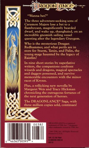 "Wanna Bet?"The three adventure-seeking sons of Caramon Majere lose a bet to a flamboyant, magnificently bearded dwarf, and wake up, shanghaied, on an incredible gnomish sailing vessel questing after the legendary Graygem.Who is the mysterious Dougan Redhammer, and what perils are in store for Sturm, Tanin, and Palin, the young mage haunted by the legacy of Raistlin?In nine short stories by superlative writers, the companions confront wizards and dragons, magical spectacles and daggers possessed, and survive memorable encounters with the minor races of Krynn.Plus, a rolicking new novella by Margaret Weis and Tracy Hickman chronicling the outrageous fortunes of the next generation of heroes.The Dragonlance Saga, with three million copies sold, continues!