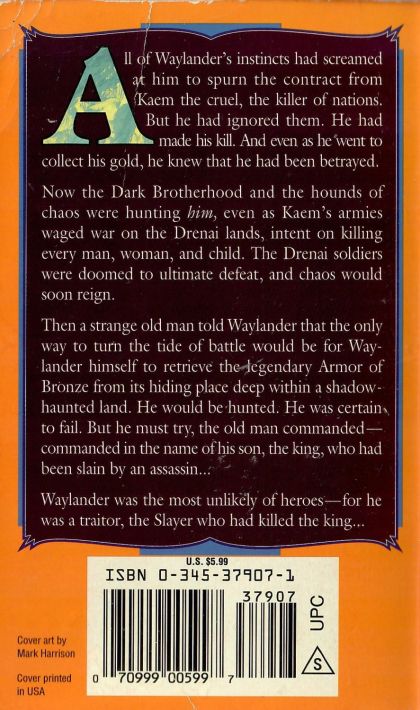 All of Waylander's instincts had screamed at him to spurn the contract from Kaem the cruel, the killer of nations. But he had ignored them. He had made his kill. And even as he went to collect his gold, he knew that he had been betrayed.Now the Dark Brotherhood and the hounds of chaos were hunting him, even as Kaem's armies waged war on the Drenai lands, intent on killing every man, woman, and child. The Drenai soldiers were doomed to ultimate defeat, and chaos would soon reign. Then a strange old man told Waylander that the only way to turn the tide of battle would be for Waylander himself to retrieve the legendary Armor of Bronze from its hiding place deep within a shadow-haunted land. He would be hunted. He was certain to fail. But he must try, the old man commanded--commanded in the name of his son, the king, who had been slain by an assassin... Waylander was the most unlikely of heroes--for he was a traitor, the Slayer who had killed the king...