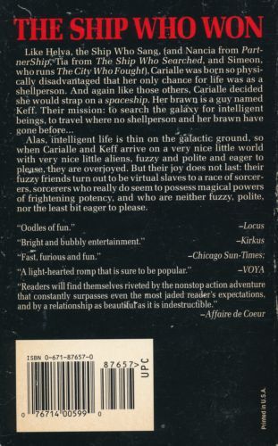 There are those whose bodies are too damaged by heredity, disease, or catastrophic accidents to survive outside a mechanical support system. When one of them becomes a shellperson, they choose to strap on a spaceship, and roam the universe with a powerful starship for a body. Bright and spunky Tia was afflicted a mysterious neural disorder. Now she searches for the cause -- to put a stop to it. And Carialle and her partner Keff are explorers who have found an inhabited world with very friendly aliens. Unfortunately, the planet has secret rulers who are anything but friendly....